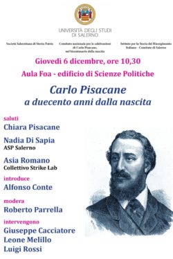 Oggi, giovedì 6 dicembre, ore 10,30, presso l’Aula Foa, edificio di Scienze Politiche del Campus di Fisciano dell’Università degli Studi Salerno, si svolgerà un incontro di studio dal titolo Carlo Pisacane a duecento anni dalla nascita.