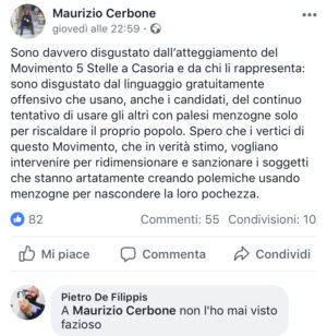 Il nostro direttore era già intervenuto con un post sul suo profilo personale lamentando l’arroganza della Vignati e l’aggressivita del Movimento 5 Stelle casoriano, chiedendo l’intervento dei vertici regionali e nazionali del Movimento fondato da Beppe Grillo. Intervento che il giorno successivo era arrivato, visto la telefonata in redazione della stessa Vignati per scusarsi.