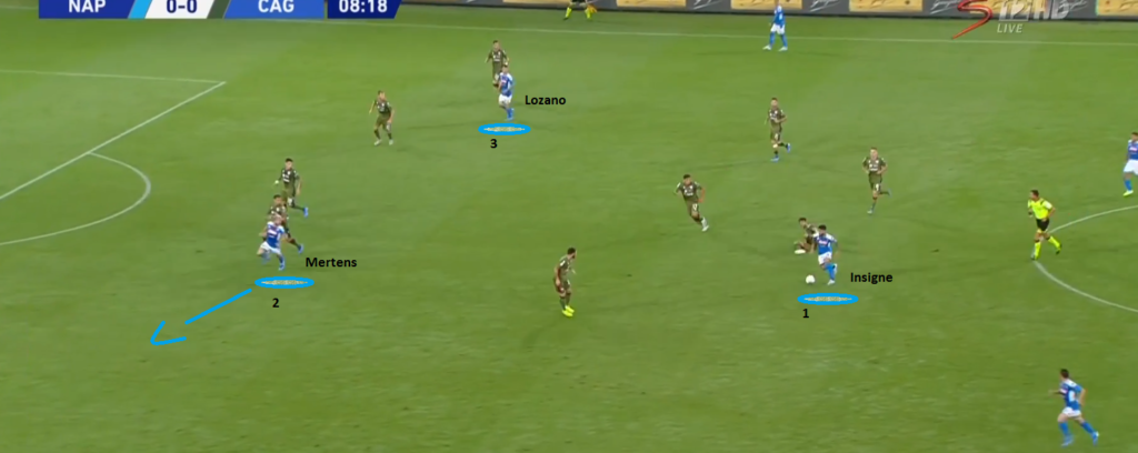 Questo metodo ha portato spesso Insigne ad abbassarsi e spesso è stato Mertens a cercare maggiormente l’esterno del campo per non risultare prevedibile.