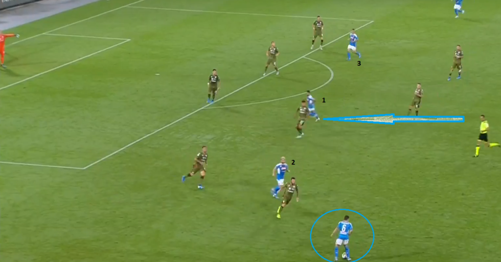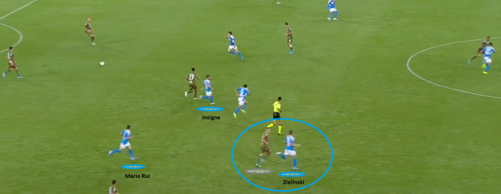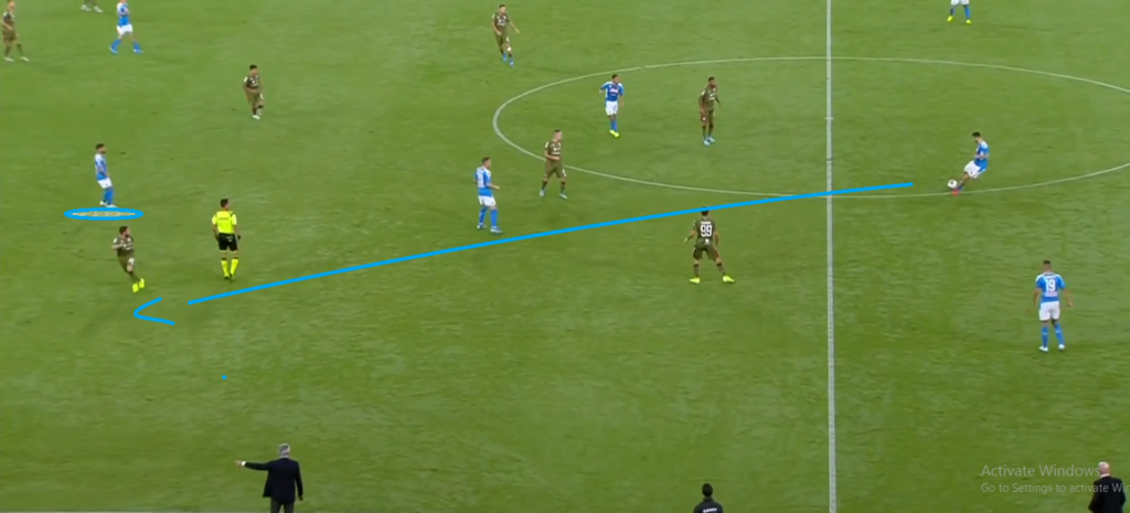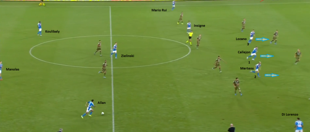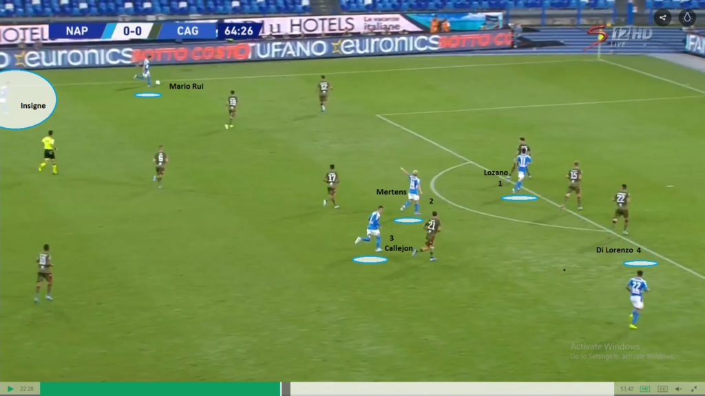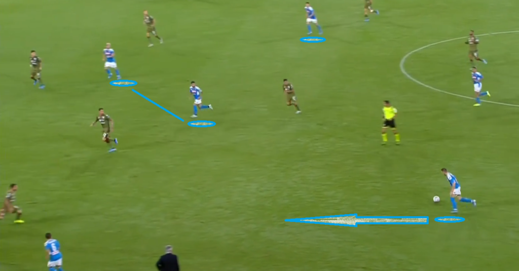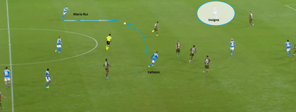 Dopo che Callejon preferirà la progressione di Mario Rui, il quale, inevitabilmente, by passerà Insigne per convergere e crossare verso il centro.