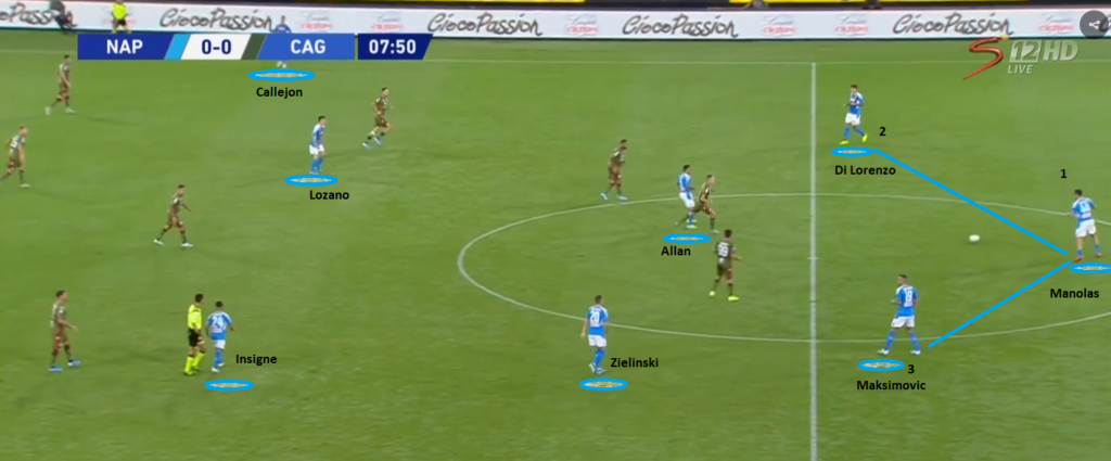 Il Napoli schierato in campo contro il Cagliari vedeva una costruzione di gioco a tre, con un solo terzino alto (Mario Rui) con lo scopo di creare una forte densità centrale nella trequarti avversaria