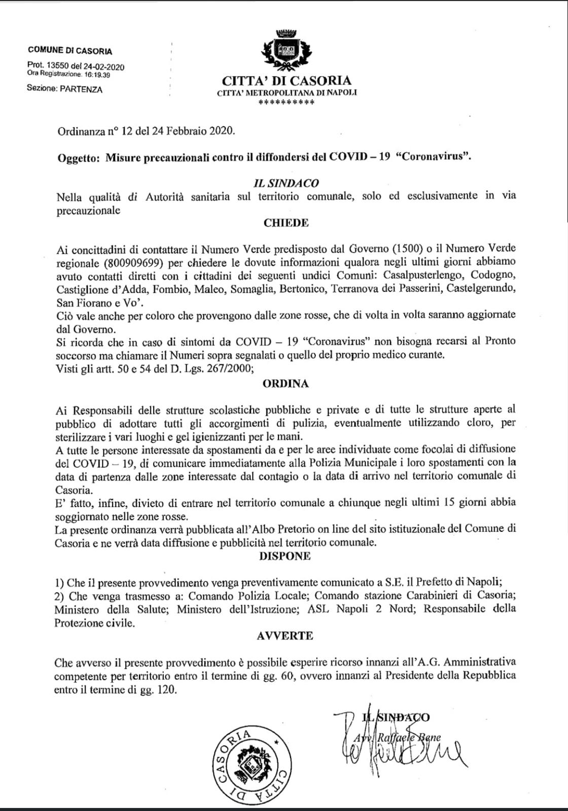 Il Sindaco ha ordinato a tutti i responsabili delle scuole pubbliche e private e degli uffici pubblici di attuare tutti gli accorgimenti di pulizia, eventualmente utilizzando cloro, per sterilizzare i luoghi e igienizzare le mani. Tutte le persone interessate da spostamenti da e verso le zone di diffusione del Covid-19 di comunicarlo alla Polizia Locale nei dettagli. Ed è fatto divieto di entrare nel territorio comunale di Casoria a chi negli ultimi 15 giorni ha soggiornato nelle zone rosse.