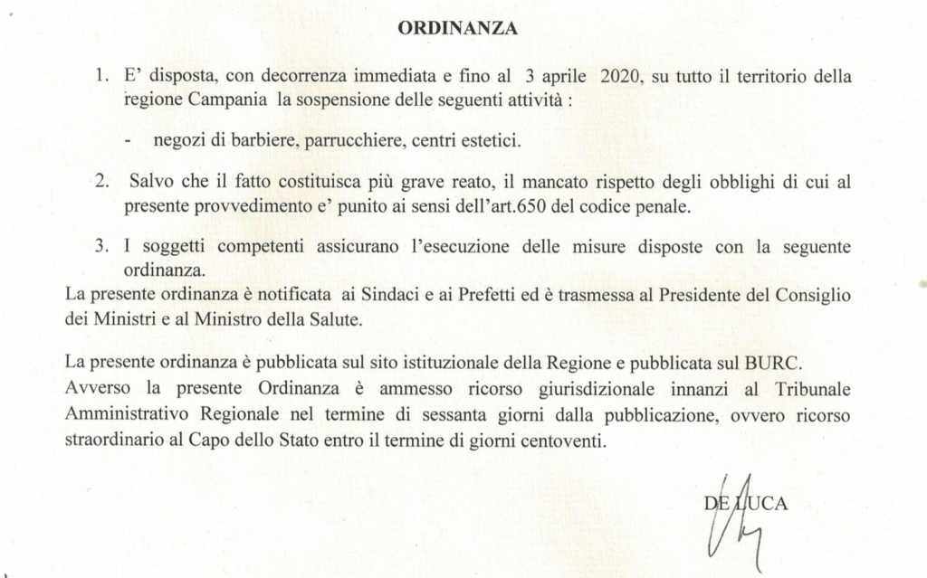 Il Governatore della Regione Campania con propria ordinanza – visto il DPCM 9 marzo 2020, recante Ulteriori disposizioni attuative del decreto-legge 23 febbraio 2020 n.6, recante misure urgenti in materia di contenimento e gestione dell’emergenza epidemiologica da COVID 19 – ha disposto con decorrenza immediata e fino al 3 aprile 2020, la chiusura degli esercizi pubblici di barbiere, parrucchiere, centri estetici.