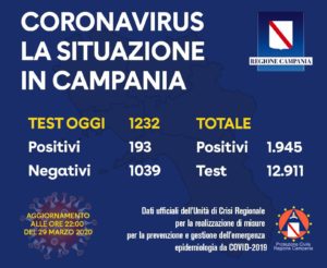 Quest’oggi sono stati effettuati 1232 tamponi, di cui 193 sono risultati positivi. Al momento il bilancio totale dei contagiati da coronavirus in Campania è salito a 1945.