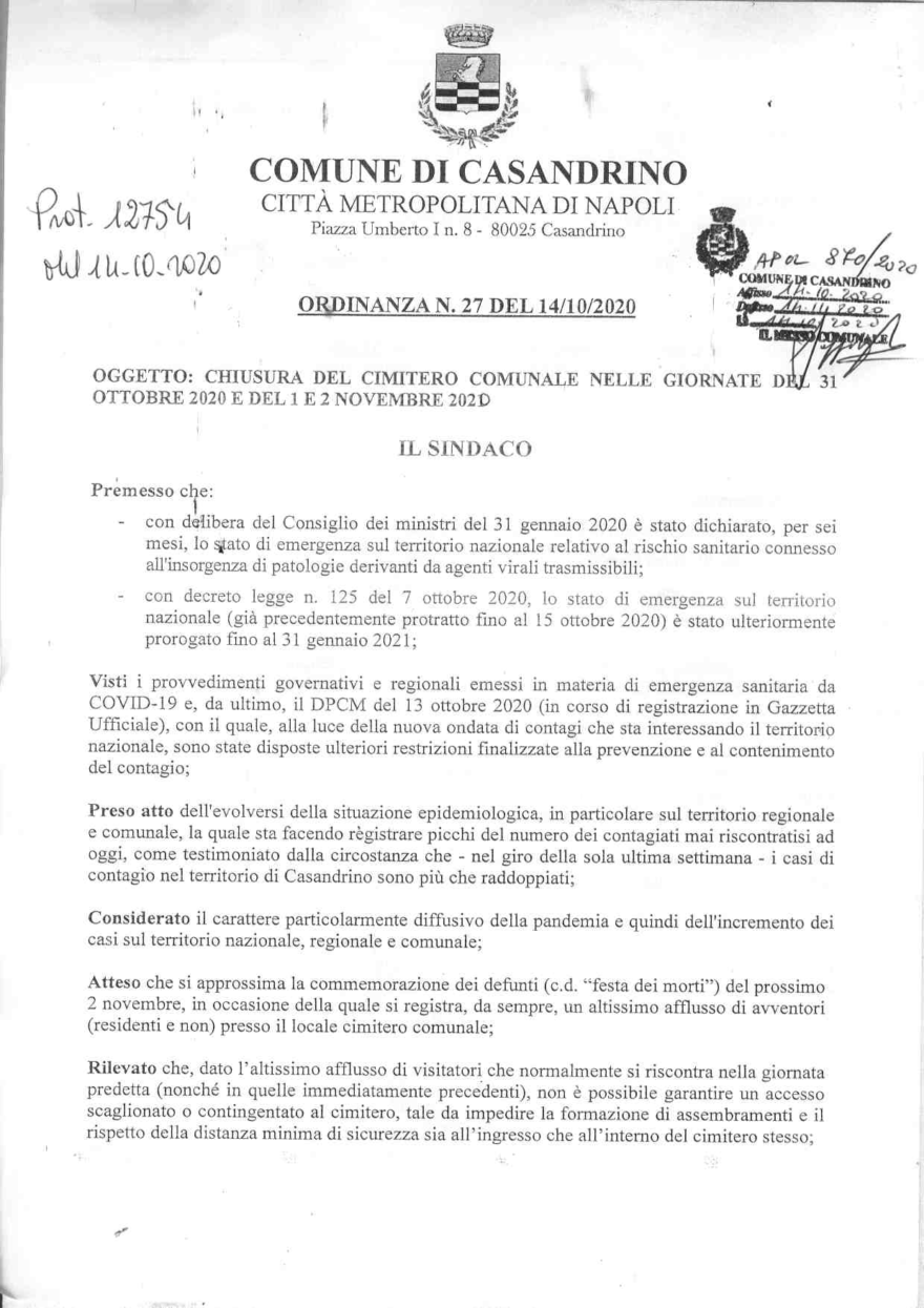 La stessa ordinanza è stata adottata dai sindaci di Cardito e Crispano per il cimitero consortile.