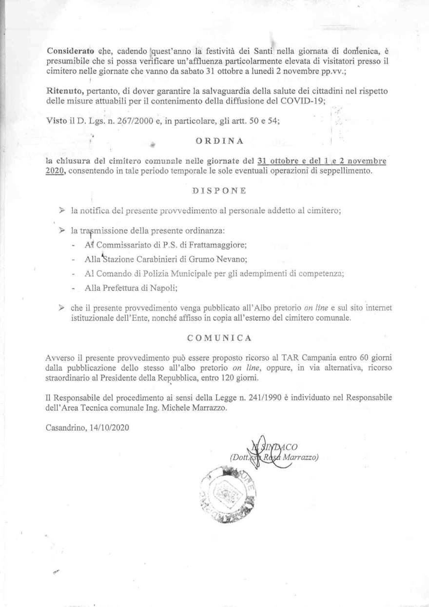 Il Sindaco di Casandrino, Rosa Marrazzo, ha firmato l’ordinanza di chiusura del cimitero nelle giornate del 31 ottobre, 1 e 2 novembre 2020. La decisione è adottata nell’ambito delle misure di prevenzione per limitare il contagio da SARS-COV2.