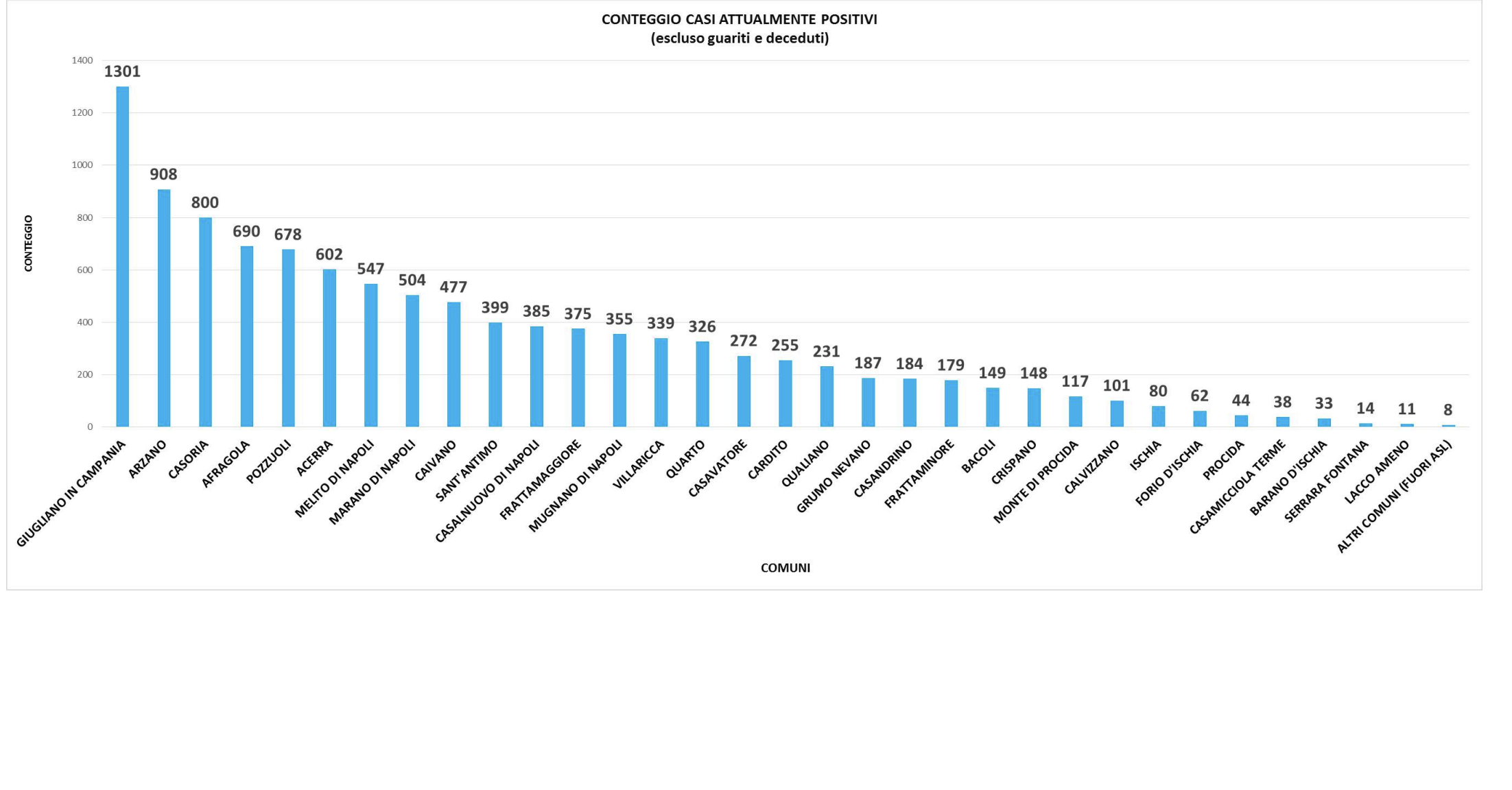 Boom a Giugliano che supera quota 1300 contagi, numero elevato ad Arzano (908), tocca quota 800 Casoira. 693 i positivi ad Afragola, 375 a Frattamaggiore.
