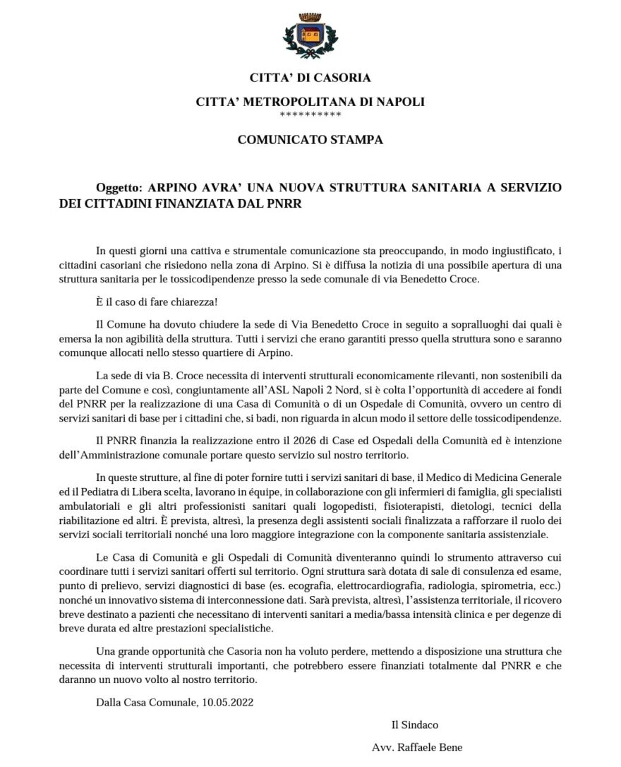 Casoria – Il Sindaco Raffaele Bene, in un lungo comunicato, ha annunciato che nella popolosa frazione di Arpino sorgerà un Ospedale di Comunità grazie ai fondi del PNRR.