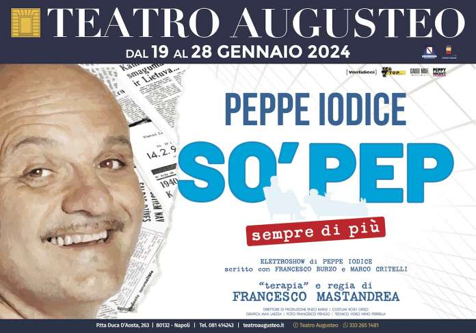 Peppe Iodice sarà in scena, da venerdì 19 a domenica 28 gennaio al teatro Augusteo (Napoli – Piazzetta duca D’Aosta 263), con “So’ Pep …sempre di più”, elettroshow di Peppe Iodice scritto con Francesco Burzo e Marco Critelli, con la regia e ‘terapia’ di Francesco Mastrandrea: “Tutto il mondo sta provando a venire fuori da un periodo estremamente complesso: guerra, pandemia, crisi economica hanno cambiato le regole del gioco, e per gli artisti non ha fatto differenza, così quando nella scorsa stagione abbiamo pensato al nuovo spettacolo insieme a Peppe Iodice, ci siamo detti che forse ci avrebbe fatto bene usare questo nuovo show come un’occasione per liberarci dalle nostre paure, preoccupazioni, perplessità, e dove farlo se non in teatro? Da sempre nostro luogo preferito per esprimere emozioni. Abbiamo così deciso di condividere con gli spettatori le riflessioni, i pensieri e la personalissima visione comica della realtà che ha reso Peppe un beniamino del pubblico.