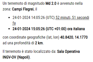 Dopo un periodo di calma oggi alle ore 15.05 è stato registrato un terremoto di magnitudo 2 con una profondità di 2,5 km nei Campi Flegrei a Napoli.