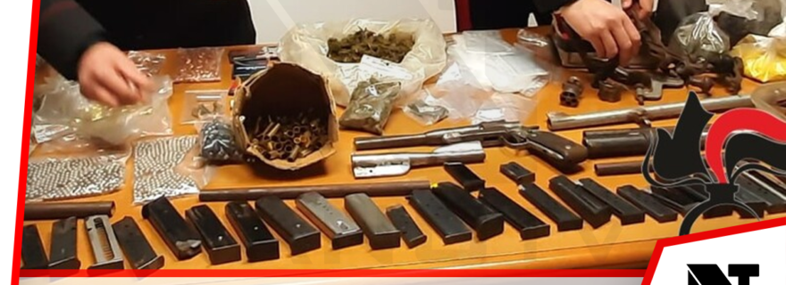 Sequestrati una pistola artigianale funzionante, 33 caricatori, 2 cartucce per fucile, 10 proiettili di vario calibro, oltre mezzo chilo di polveri da sparo. Non solo armi, anche droga.