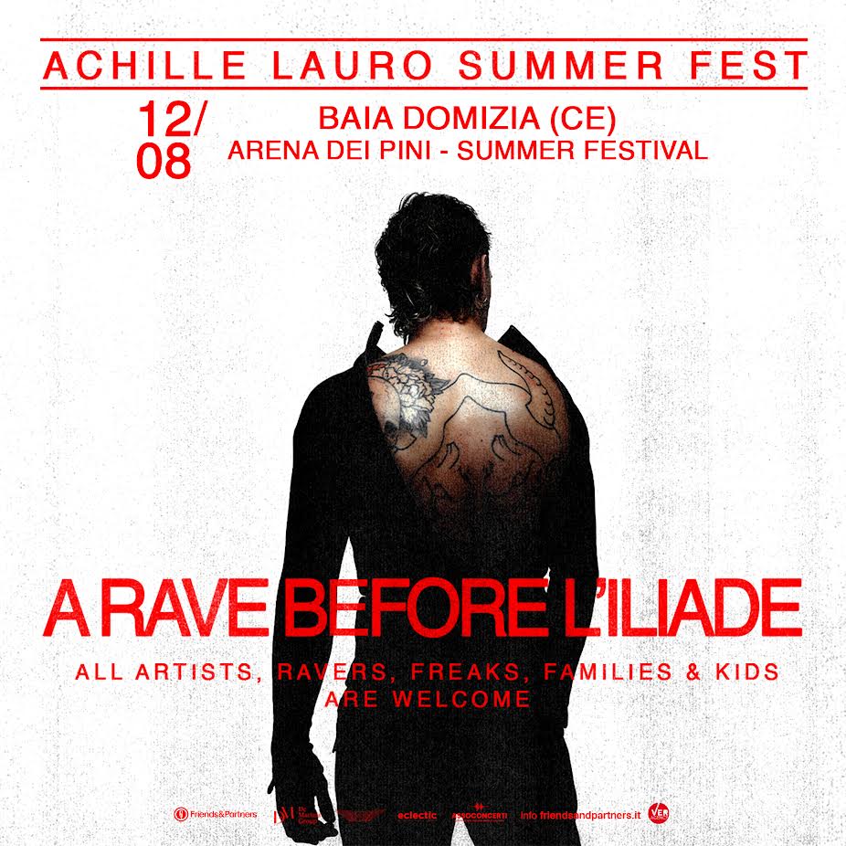 Achille Lauro Summer Fest – A RAVE BEFORE L’ILIADE partirà con i primi live il 13 luglio da Brescia – Brescia Summer Music, Arena Campo Marte per proseguire poi il 19 luglio a Mirano (VE) – Mirano Summer Festival, il 1 agosto a Gallipoli (LE) – Oversound Music Festival – Parco Gondar, il 12 agosto a Baia Domizia (CE) – Arena dei Pini – Summer Festival, il 14 agosto a Cattolica – Arena della Regina, il 16 agosto a Castiglioncello (LI) – Castiglioncello Festival – Castello Pasquini, il 17 agosto a Forte dei Marmi (LU) – Villa Bertelli Live, il 21 agosto a Corigliano-Rossano (CS) – Anfiteatro De Rosis, il 23 agosto a Catania – Sotto Il Vulcano Fest, Villa Bellini, il 24 agosto a Palermo – Dream Pop Festival, Teatro di Verdura per chiudere il 2 settembre a Vicenza – Vicenza In Festival, Piazza dei Signori.