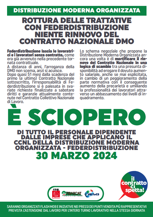 SCIOPERO LAVORATORI CCNL DMO-FEDERDISTRIBUZIONE – SABATO 30 MARZO 2024 INTERO TURNO DI LAVORO