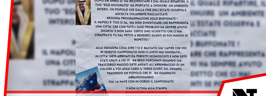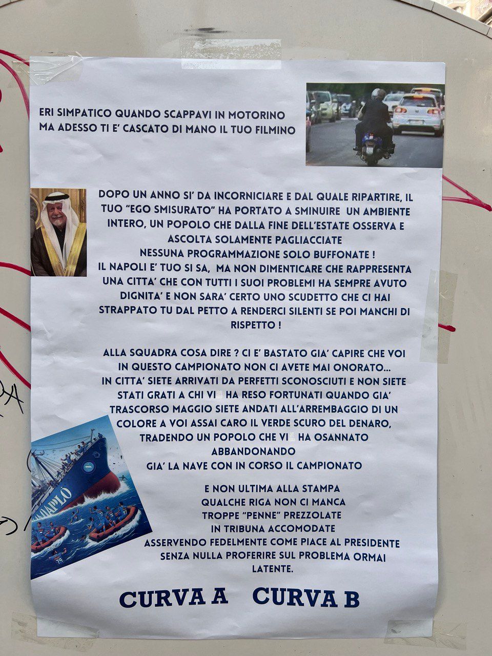 La comparsa dei manifesti nella città di Napoli rivolti contro Aurelio De Laurentiis emerge attraverso un annuncio social lanciato dal giornalista Luca Cerchione. Il testo, su cui sono apposte le firme Curva A e Curva B, mira alla critica della gestione obiettivamente disastrosa del presidente del Napoli dopo la conquista dello scudetto, oltre che dell’atteggiamento passivo di un gruppo di calciatori che, solamente un anno prima, festeggiava la vittoria.