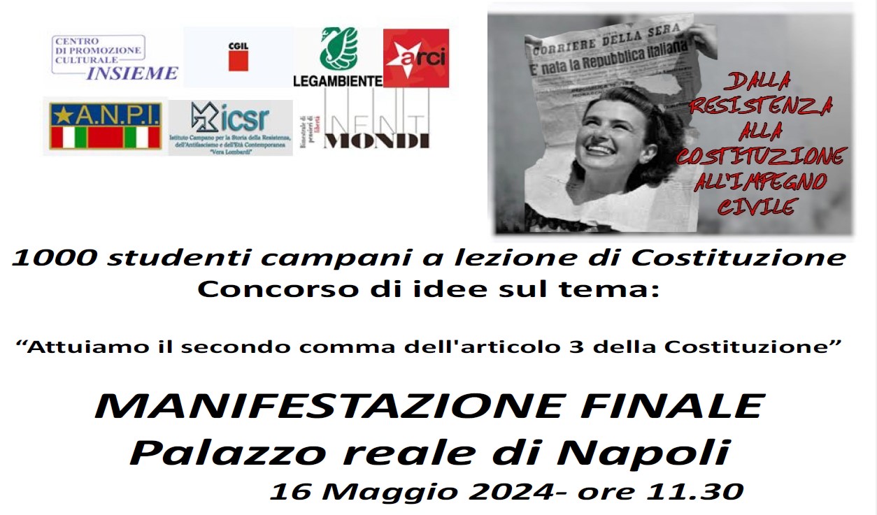 Giovedi 16 maggio alle ore 11.30, nella sala “Satellite” al Palazzo Reale di Napoli, si terrà l’incontro finale del Progetto formativo-Concorso di idee “Attuiamo il secondo comma dell’articolo 3 della Costituzione”.