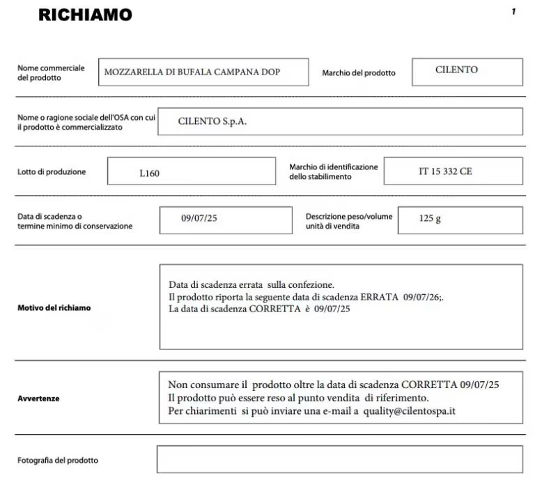 Il Ministero della Salute ha disposto il richiamo di un lotto di Mozzarella di Bufala Campana DOP a marchio Cilento, a causa di un errore sulla data di scadenza riportata sull’etichetta. Si tratta del lotto L160, confezionato in porzioni da 150 grammi, che indica erroneamente come termine di conservazione il 09/07/2026 invece del corretto 09/07/2025.