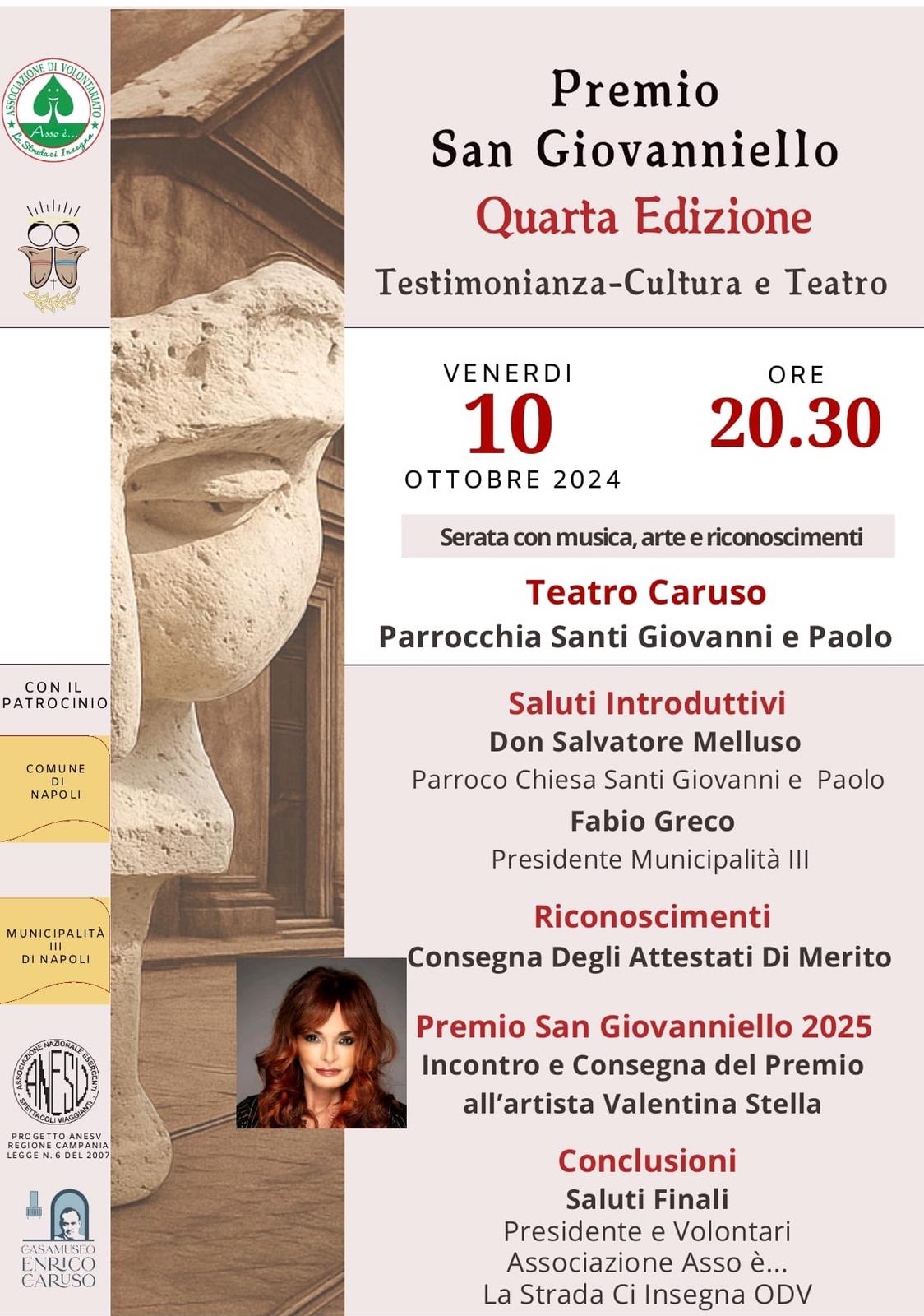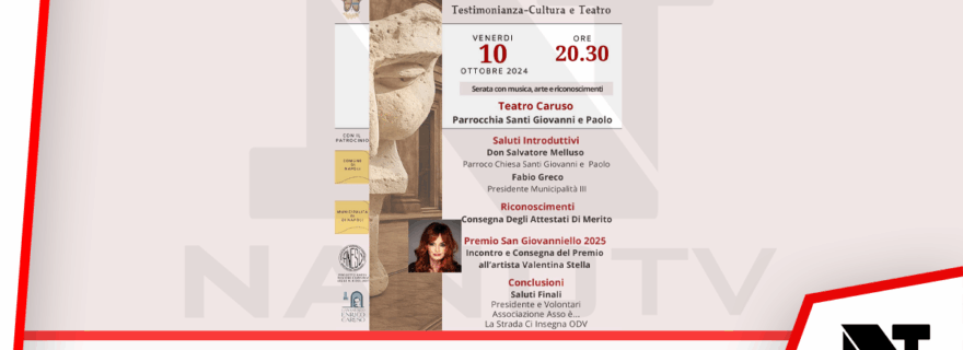 Napoli – Venerdì 10 ottobre 2025, alle ore 20:30, il Teatro Caruso di Piazza Ottocalli ospiterà la IV Edizione del Premio San Giovanniello, l’iniziativa ideata e promossa dall’Associazione Asso è… La Strada Ci Insegna ODV per celebrare il legame tra arte, territorio e impegno sociale.