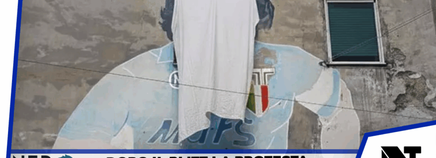 Un lenzuolo bianco calato dall’alto a coprire il volto del murale di Maradona che domina la piazza che a Napoli prende il nome dal Pibe de Oro. E’ durata qualche ora la protesta messa in scena in mattinata dagli animatori del largo dei Quartieri Spagnoli dedicato all’indimenticato campione argentino, da anni meta di turisti in processione e ieri teatro di un blitz della Polizia Municipale che ha sequestrato magliette e gadgets. Un telone blu, inoltre, ha coperto la cappella dove si trovano i cimeli e le statue dedicate all’ex campione del Napoli.