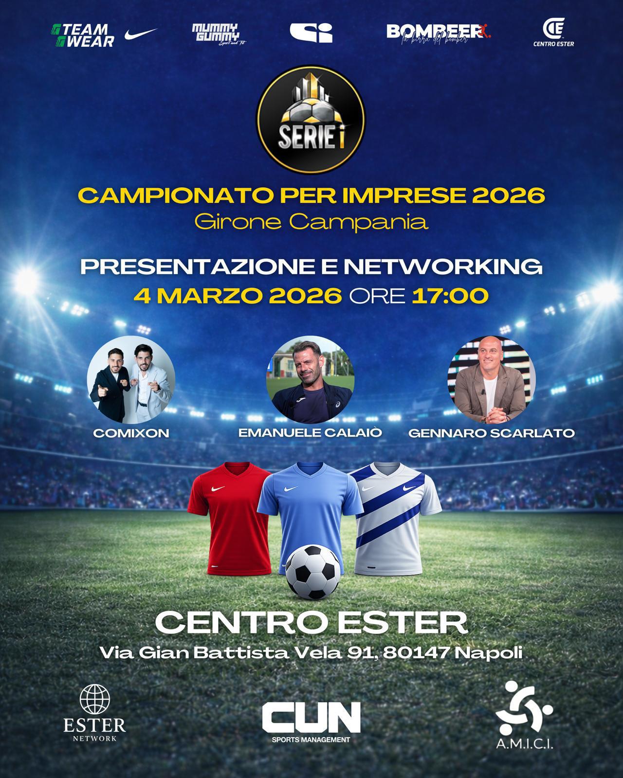 Napoli si prepara a ospitare la presentazione della SERIE I 2026, il Campionato Nazionale di Calcio per le Aziende, un progetto che unisce sport, networking e solidarietà. L’appuntamento è fissato per mercoledì 4 marzo 2026 alle ore 17:00 presso il Centro Ester – Teatro Pompeo Cent’anni, in via Giambattista Vela.