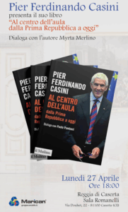 Lunedì, 27 aprile 2026, alle ore 18:00, a Caserta, presso la Sala Romanelli della Reggia, avrà luogo la presentazione del libro “Al centro dell’aula dalla Prima Repubblica a oggi”, edito da Il Mulino, nel corso della quale l’autore Pier Ferdinando Casini dialogherà con la giornalista, autrice e conduttrice televisiva Myrta Merlino.